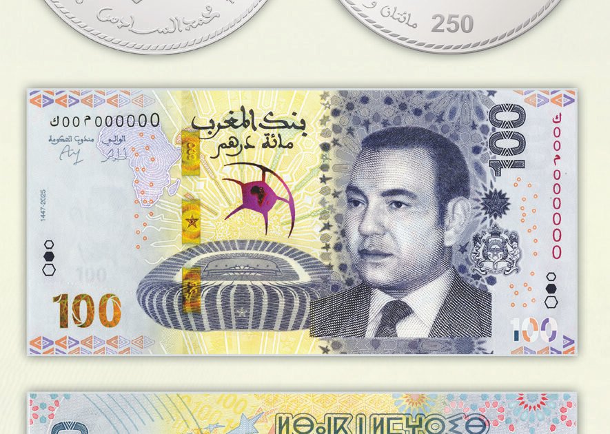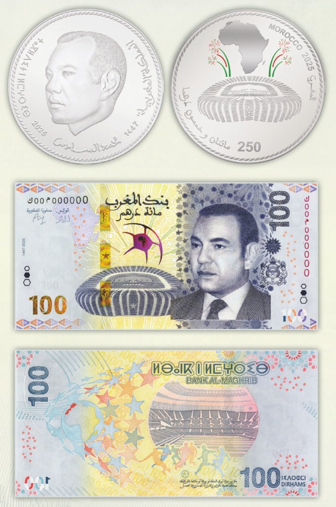 بمناسبة تنظيم الدورة الخامسة والثلاثين من كأس أمم إفريقيا – المغرب 2025، أصدر بنك المغرب قطعة نقدية تذكارية فضية من فئة 250 درهم ويطرح للتداول ورقة بنكية تذكارية من فئة 100 درهم.